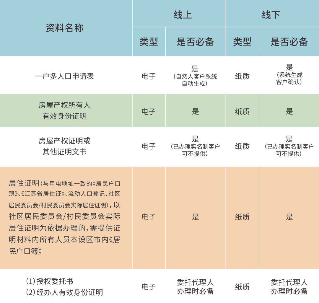 二、明确“一户多人口”人数认定业务办理要求居民用户应如实申报实际用电的居住人口,当居住人口发生变化时,应及时申报调整。上述政策自“一户多人口”增加用电基数业务(下同)办理成功的当月起执行,其中:全部居住人口以《居民户口簿》为依据办理的,长期有效;以《江苏省居住证》、流动人口登记和社区居民委员会、村民委员会实际居住证明为依据办理的,有效期为一年。到期前,居民用户应及时办理相关手续,逾期未办理的,将停止执行。停止执行后,需重新办理相关手续,方可自重新办理成功的当月起再次生效,执行相应政策。省电力公司应根据本通知要求,抓紧完善申请办理细则,为广大居民用户提供营业网点、“网上国网”APP等多种申请办理渠道;通过营业网点、“网上国网”APP、“国网江苏电力”公众号等加大政策和申请办理方式的宣传力度;加强对营业网点窗口服务人员和95598热线接线人员的业务培训,做好宣传解释,确保执行到位;加快与公安部门建立人口数据互联互通,逐步简化办理手续、优化办理服务,最大程度方便居民用户的业务办理。
