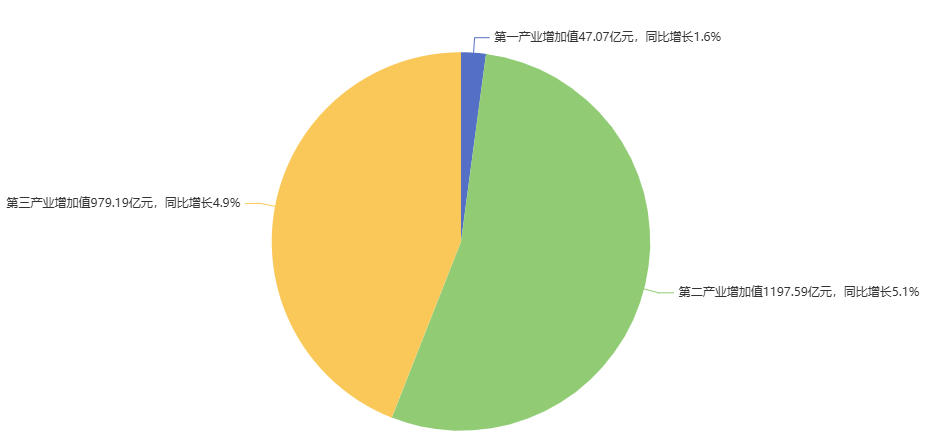 分产业看,第一产业增加值47.07亿元,同比增长1.6%,对经济增长的贡献率为0.7%,拉动经济增长0.03个百分点;第二产业增加值1197.59亿元,同比增长5.1%,对经济增长的贡献率为56.0%,拉动经济增长2.77个百分点;第三产业增加值979.19亿元,同比增长4.9%,对经济增长的贡献率为43.3%,拉动经济增长个2.15百分点。三次产业增加值之比为2.1:53.9:44.0。三产占比同比提升0.5个百分点。