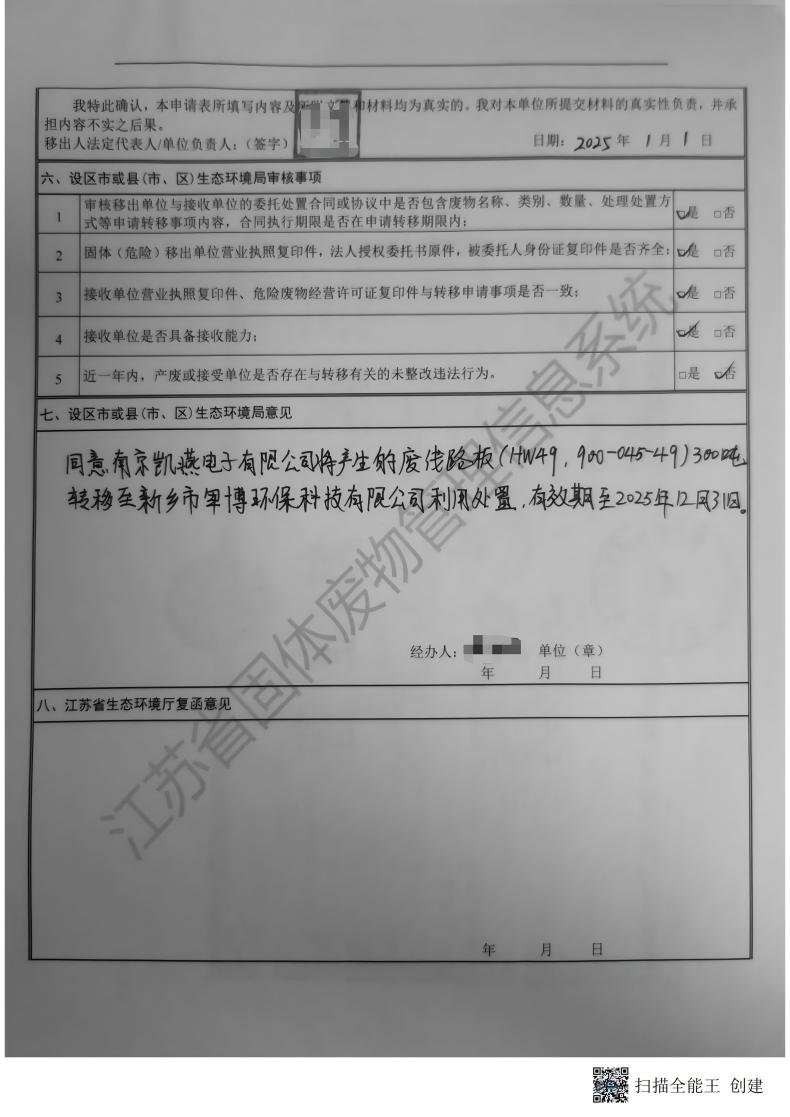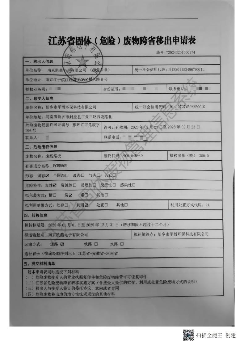 江苏省固体(危险)废物跨省移出申请表公示(南京凯燕电子有限公司)2024112802