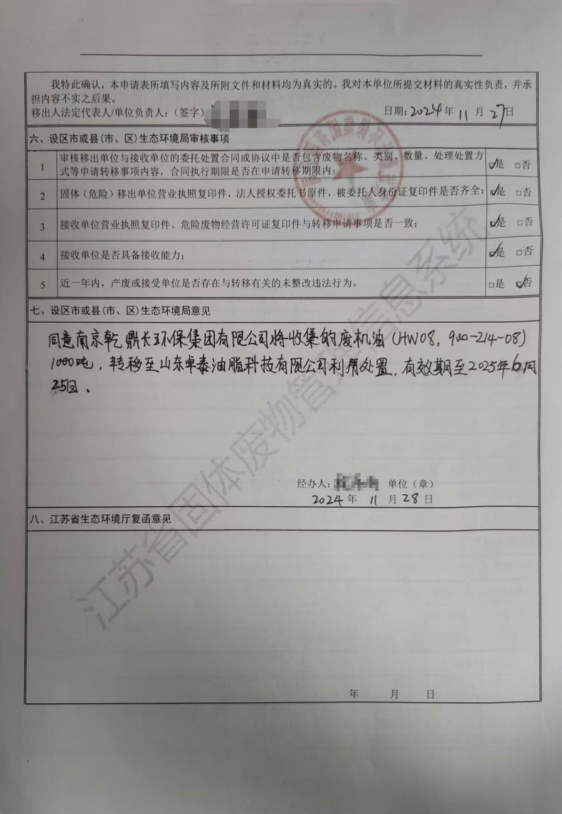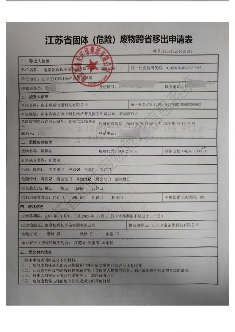 江苏省固体(危险)废物跨省移出申请表公示(南京乾鼎长环保集团有限公司)20241129