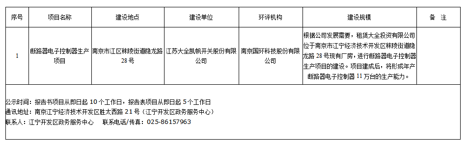 江苏大全凯帆开关股份有限公司断路器电子控制器生产项目环评受理情况公示
