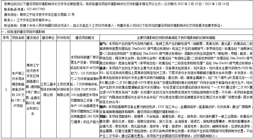 | 信息名称: | 江苏三晶半导体材料有限公司年产第三代半导体精密制造装备及材料200万台(件)生产项目环评拟批情况公示 | ||
