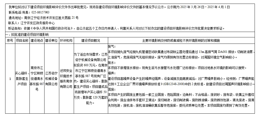 江苏佑宁机械设备有限公司实心锚杆、膨胀套生产项目环评拟批情况公示