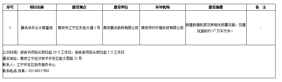 南京腾讯数码有限公司腾讯华东云计算基地项目环评受理情况公示