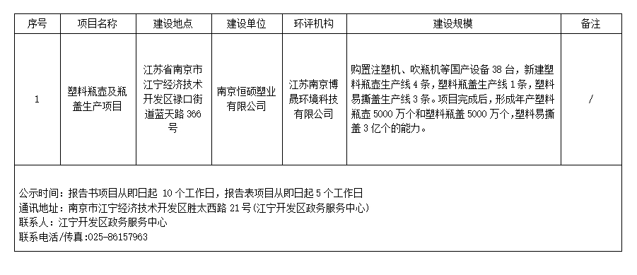 南京恒硕塑业有限公司塑料瓶壶及瓶盖生产项目环评受理情况公示