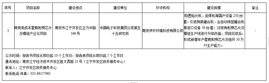 | 信息名称: | 中国电子科技集团公司第五十五研究所商用低成本星载射频芯片及模组产业化项目环评受理情况公示 | ||