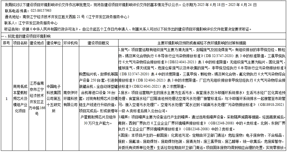 中国电子科技集团公司第五十五研究所商用低成本星载射频芯片及模组产业化项目环评拟批情况公示