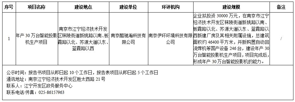 南京酷驰瀚科技有限公司年产30万台智能投影机生产项目环评受理情况公示