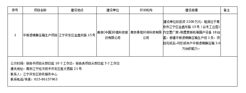 美埃(中国)环境科技股份有限公司平板滤棉静压箱生产项目环评受理情况公示