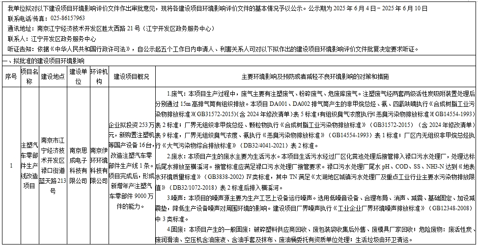 南京思成电子科技有限公司注塑汽车零部件生产线改造项目环评拟批情况公示