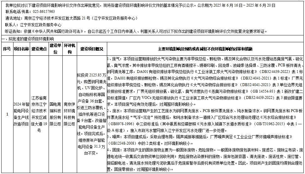 国电南瑞科技股份有限公司2024年智能电网设备生产线改造项目环评拟批情况公示