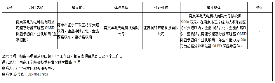 | 信息名称: | 南京国兆光电科技有限公司超高分辨率硅基OLED微显示器件产业化项目(重新报批)环评受理情况公示 | ||