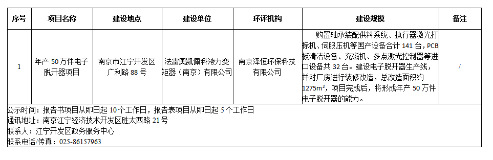 法雷奥凯佩科液力变矩器(南京)有限公司年产50万件电脱开器项目环评受理情况公示