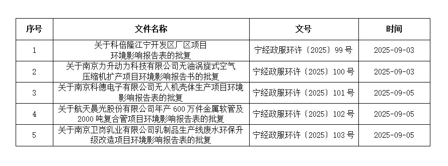 江宁开发区政务服务中心关于2025年9月1日-2025年9月5日作出的建设项目环境影响评价文件审批决定的公告