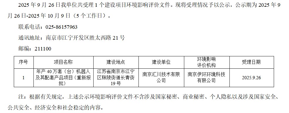 江宁开发区政务服务中心关于2025年9月26日建设项目环境影响评价文件受理情况的公示