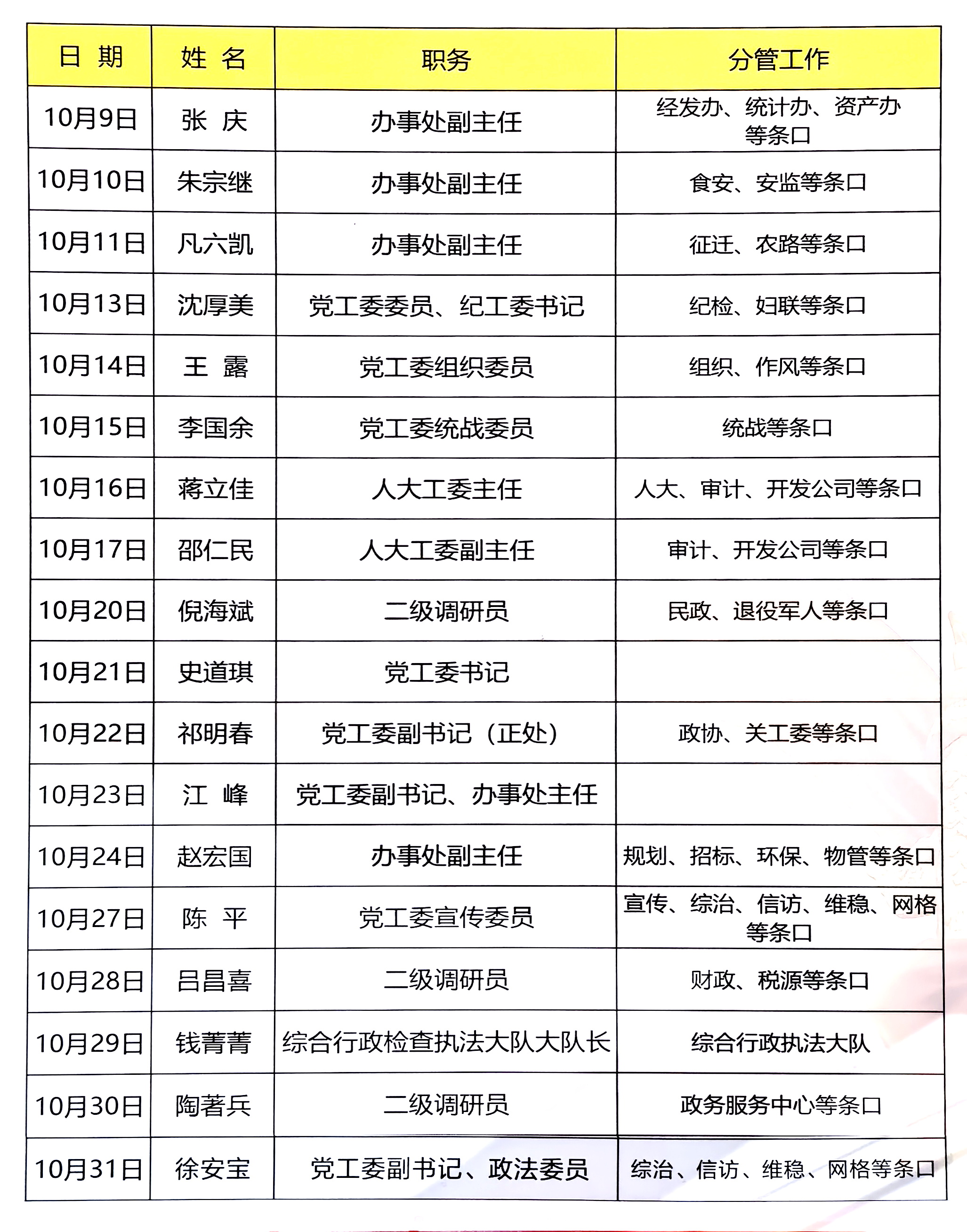 江宁街道2025年10月区管领导接访安排