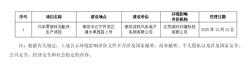 | 信息名称: | 江宁开发区政务服务中心关于2025年12月12日建设项目环境影响评价文件受理情况的公示 | ||