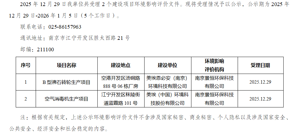 江宁开发区政务服务中心关于2025年12月29日建设项目环境影响评价文件受理情况的公示