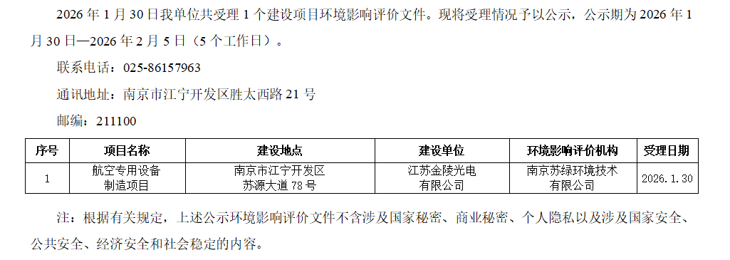 江宁开发区政务服务中心关于2026年1月30日建设项目环境影响评价文件受理情况的公示
