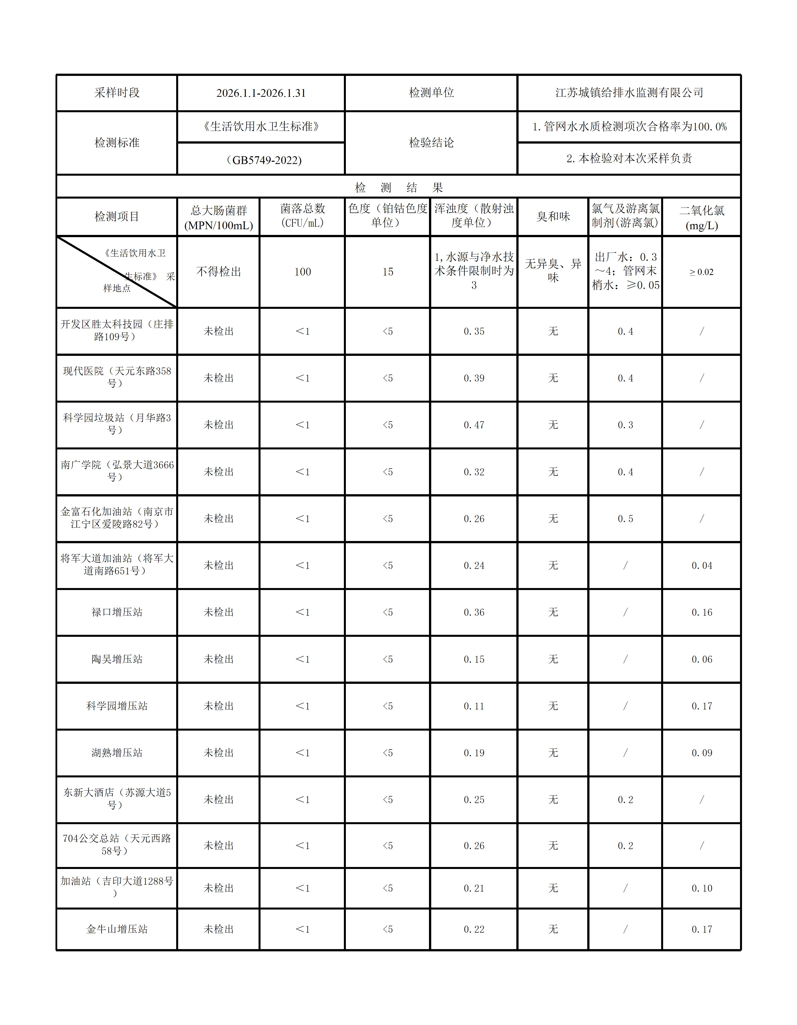 南京市江宁区水务局2026年1月管网水水质公示