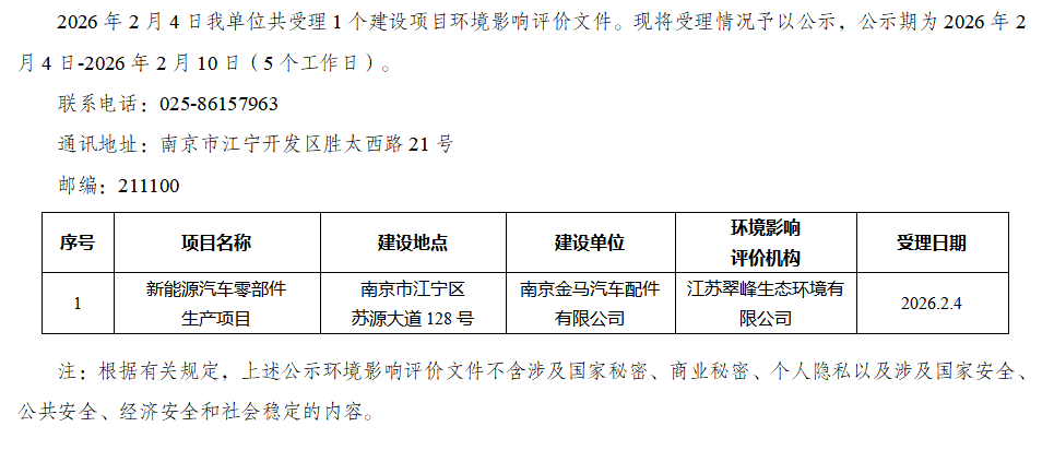 江宁开发区政务服务中心关于2026年2月4日建设项目环境影响评价文件受理情况的公示