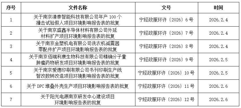 江宁开发区政务服务中心关于2026年2月2日-2026年2月6日作出的建设项目环境影响评价文件审批决定的公告