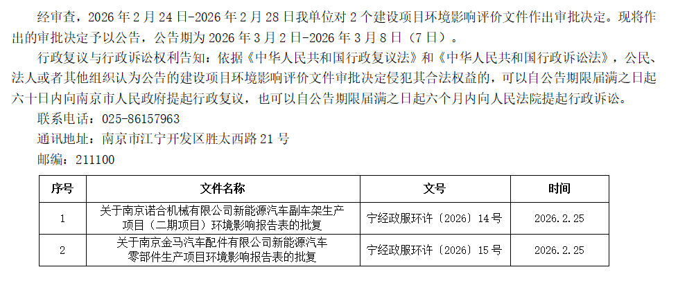 | 信息名称: | 江宁开发区政务服务中心关于2026年2月24日-2026年2月28日作出的建设项目环境影响评价文件审批决定的公告 | ||