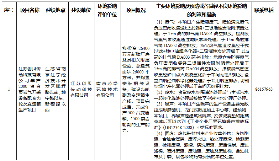 | 信息名称: | 江宁开发区政务服务中心关于江苏创贝传动科技有限公司年产2000台套页岩气开采设备配套齿轮及变速箱生产项目环境影响评价文件拟进行审查公示 | ||