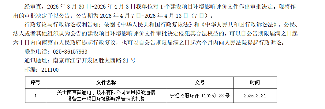 | 信息名称: | 江宁开发区政务服务中心关于2026年3月30日-2026年4月3日作出的建设项目 环境影响评价文件审批决定的公告 | ||