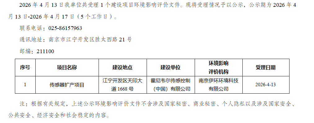 江宁开发区政务服务中心关于2026年4月13日建设项目环境影响评价文件受理情况的公示