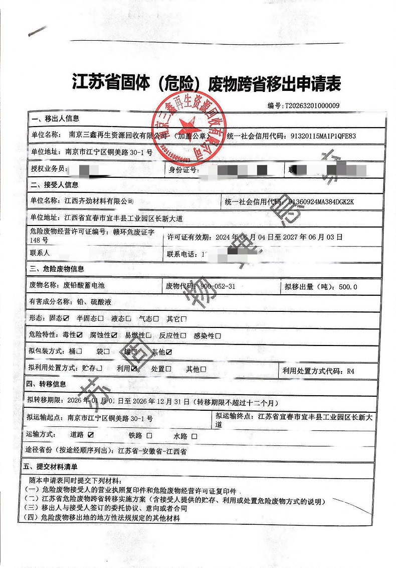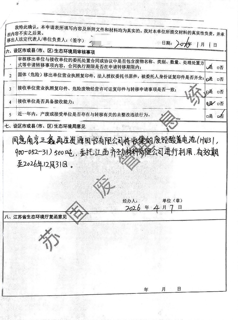 江苏省固体(危险)废物跨省移出申请表公示(南京三鑫再生资源回收有限公司)20260414