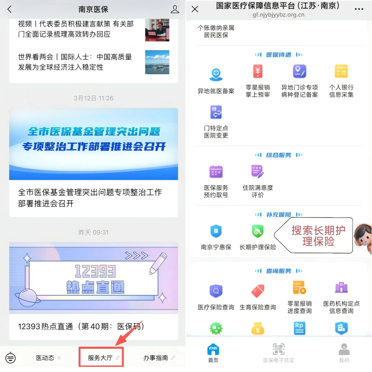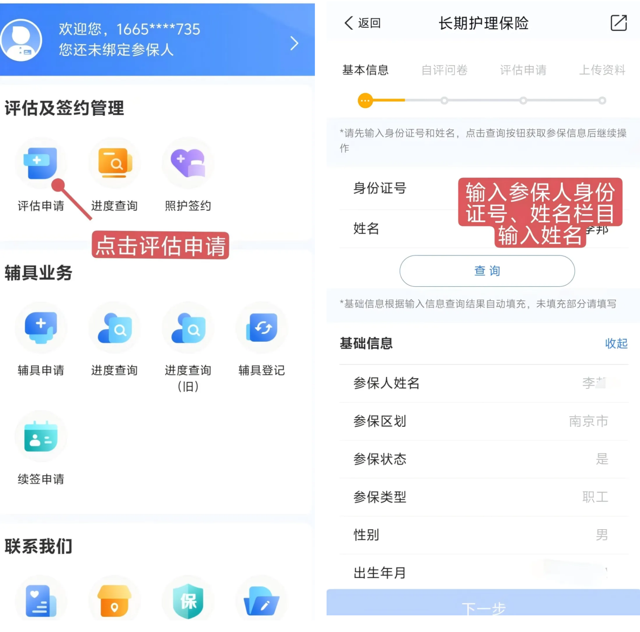 步骤一:关注“南京医保”微信公众号,点击“服务大厅”——“长期护理保险”——选择“评估申请”。输入参保人身份证号、姓名,点击查询,按步骤填写信息,提交审核。