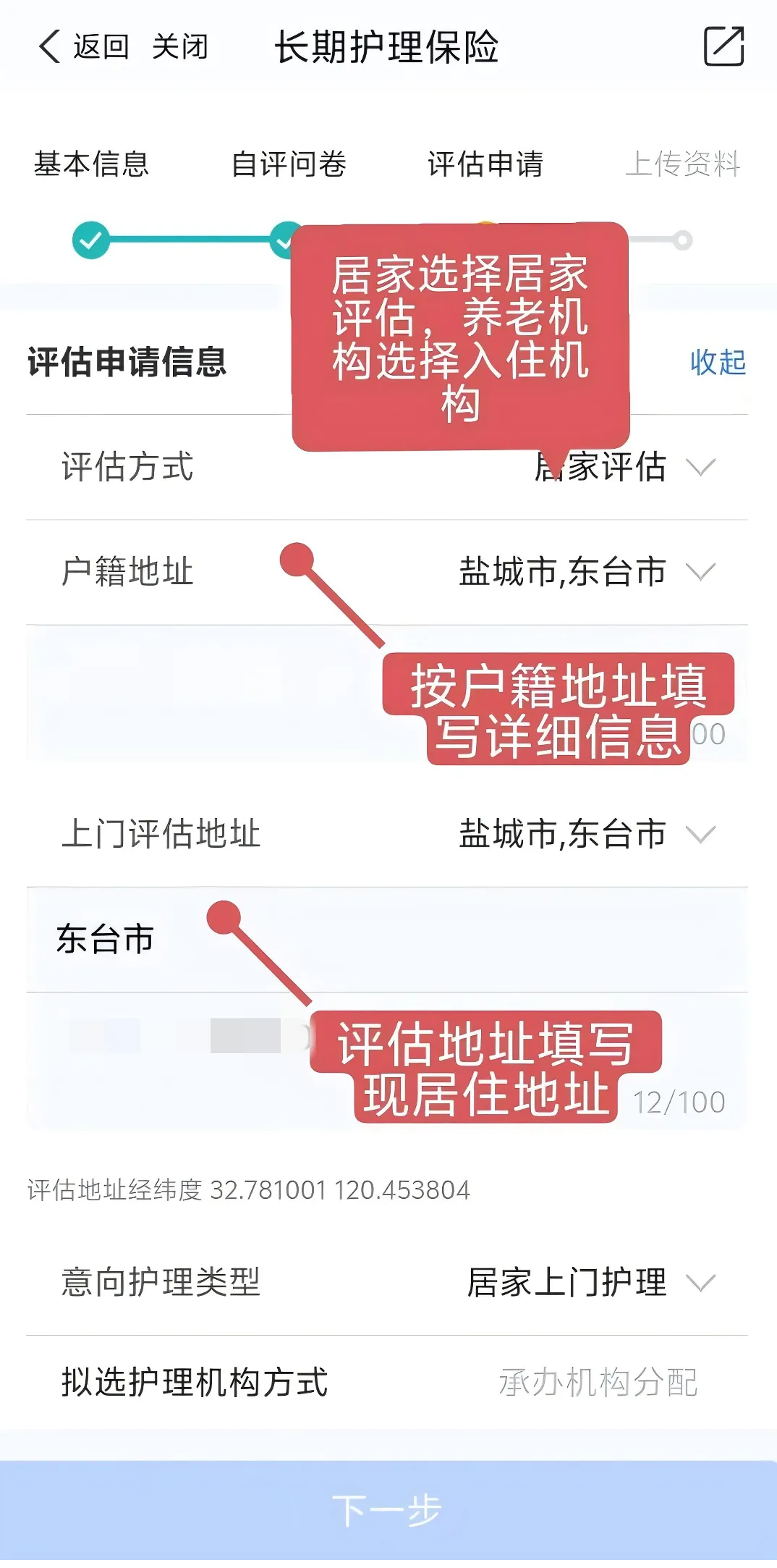 步骤三:填写评估申请信息,享受居家上门照护在评估方式选择——居家评估,意向护理类型选择——居家上门护理;享受入住照护在评估方式选择——住院评估,意向护理类型选择——机构护理。