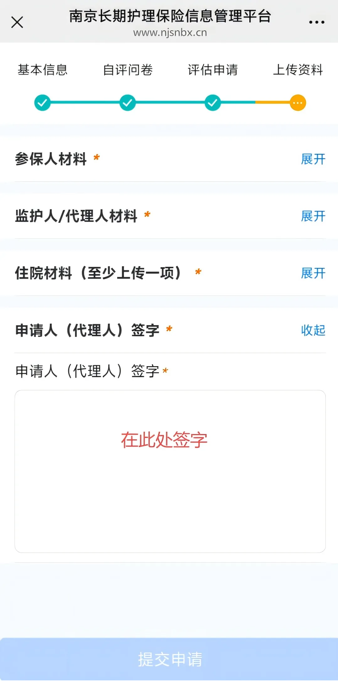 步骤四:上传材料:申请人、代理人身份证原件正反面;申请人医保卡正反面;持续失能3个月以上的失能病历材料,申请人、代理人签字。