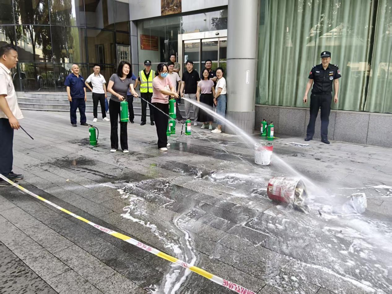 疏散完成后,消防教官在空旷场地现场演示了灭火器的正确使用方法,并指导干部职工进行实操练习。大家踊跃参与,按照 “提、拔、握、压” 的操作要领,成功扑灭模拟火源,切实掌握了灭火器的使用技能。