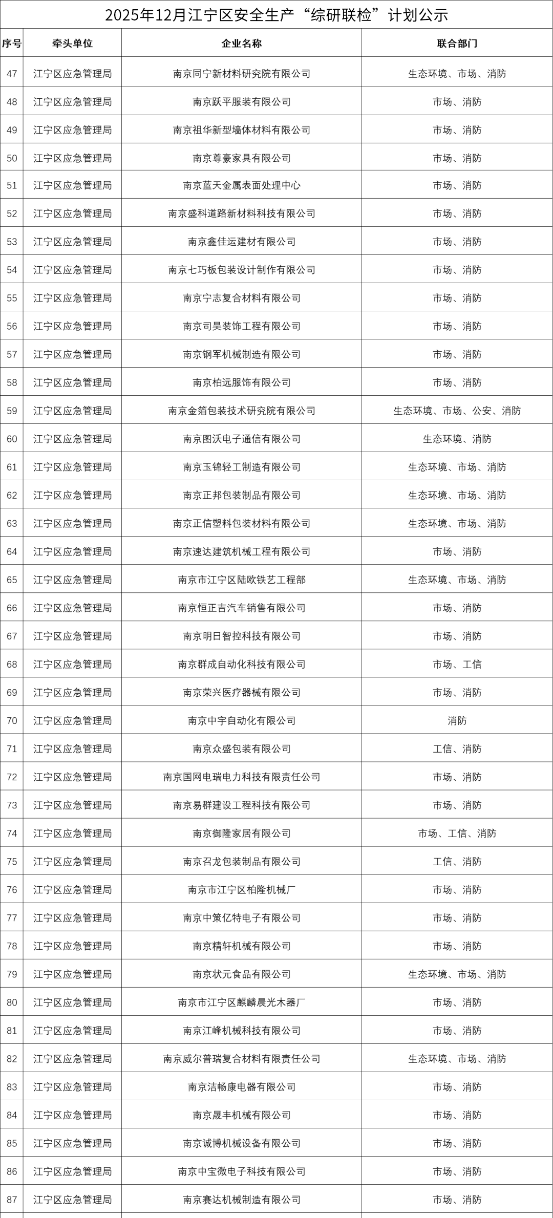 南京市江宁区应急管理局2025年12月安全生产“综研联检”公示名单